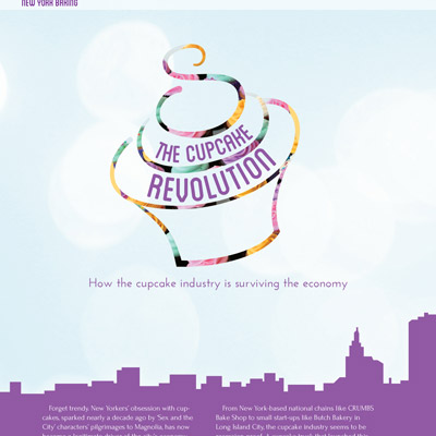 For a publication design class we were set the task of creating a two-page magazine spread for a fictitious article on how the cupcake industry is adapting to a changing economic landscape. Is there even a cupcake industry? π€·π»ββοΈ